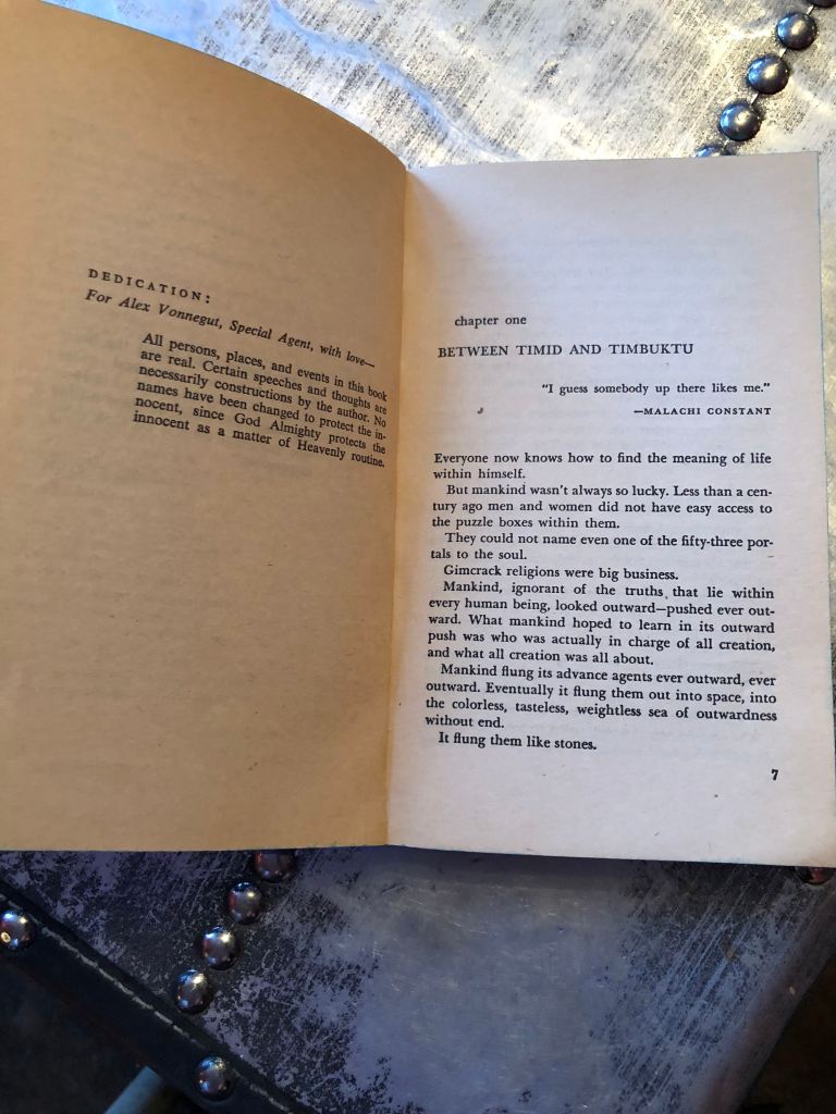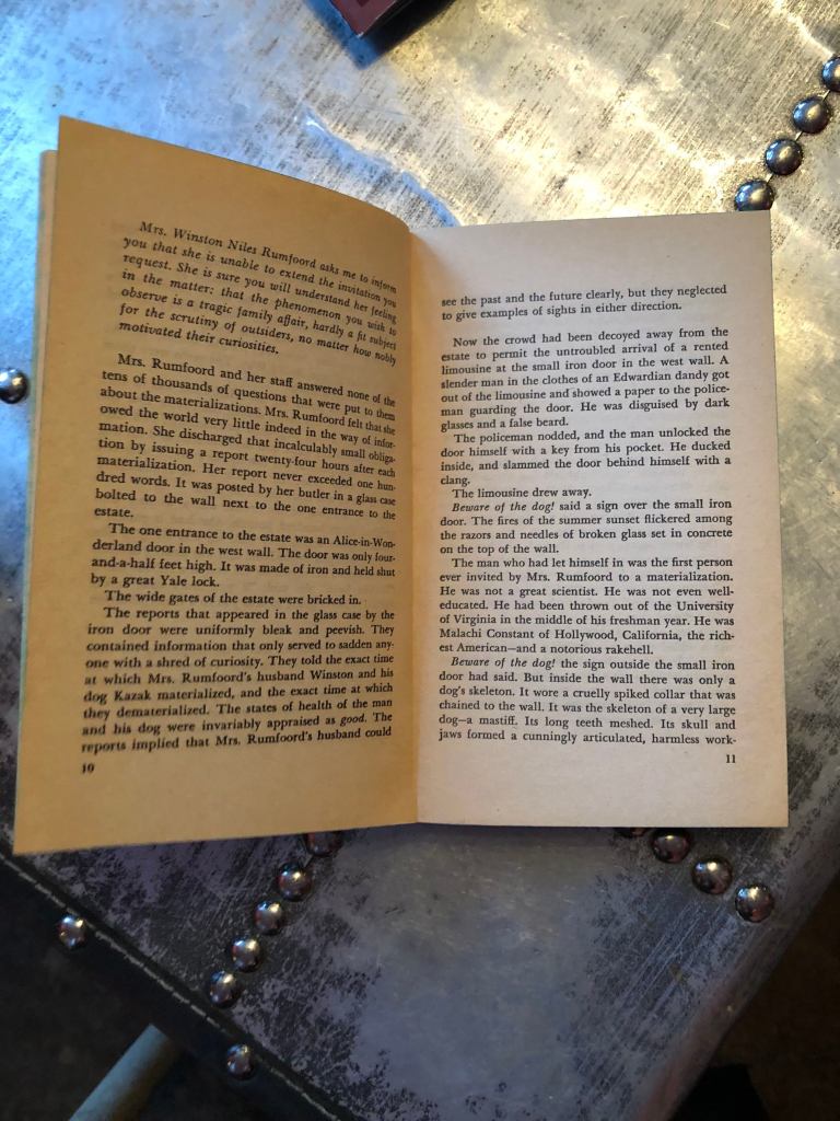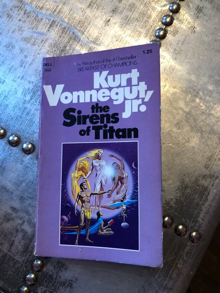 Interesting. The colour calls to me. Then I notice the graphics. Has that Egyptian/Greecian vibe. Then boom the title – ‘The Sirens of Titan’.